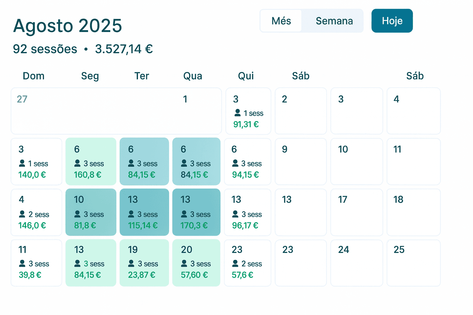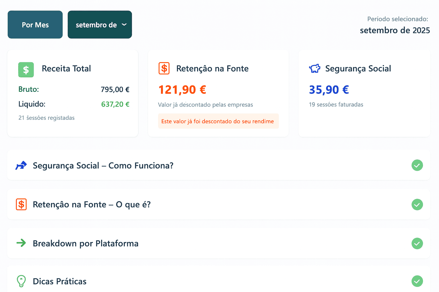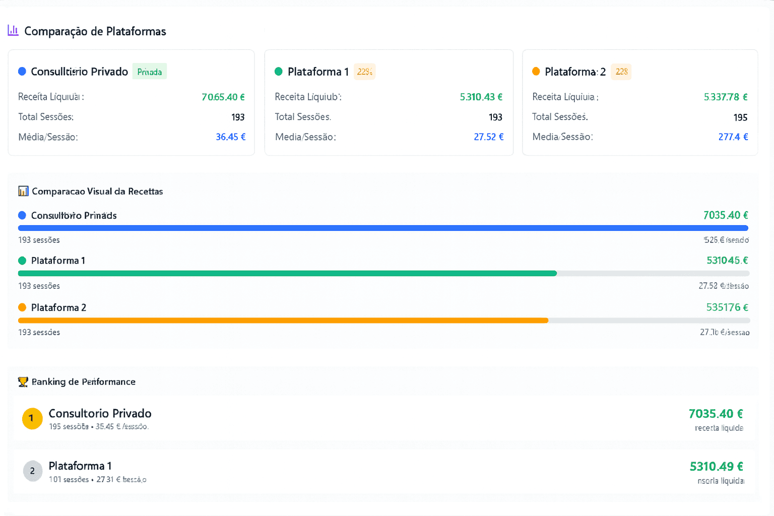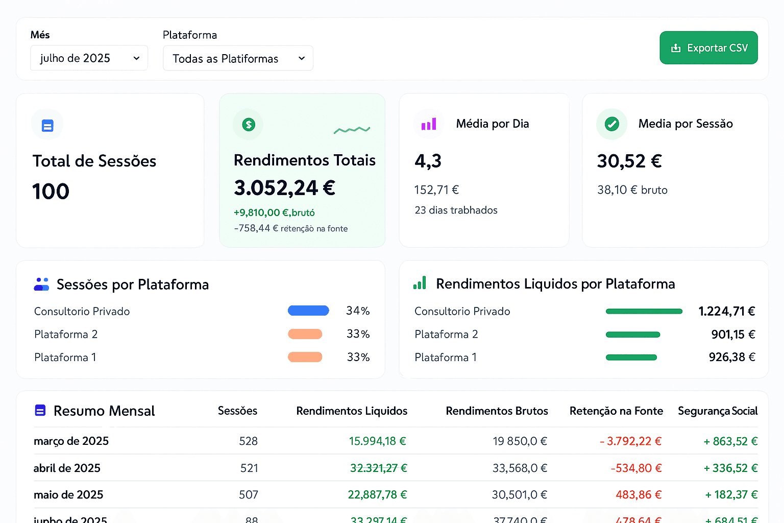 Transparência total nos ganhos — vê quanto recebes por consulta, por mês e por plataforma, automaticamente.